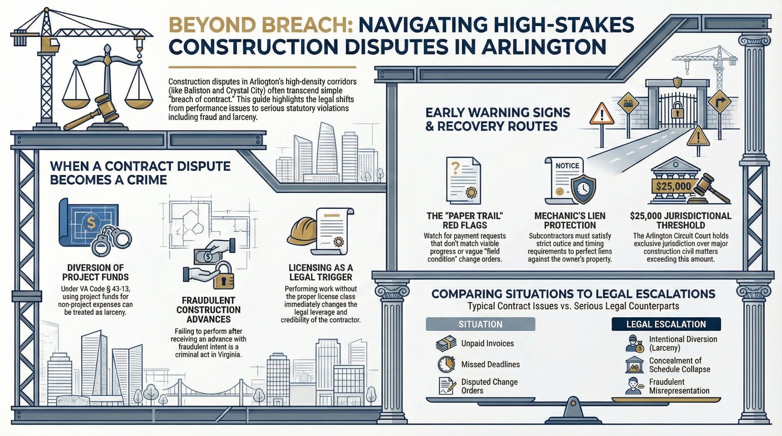 If you are dealing with a construction dispute in Arlington County involving fraud, delay, or nonpayment, the right legal analysis starts with understanding that not every project breakdown is just a breach-of-contract case.