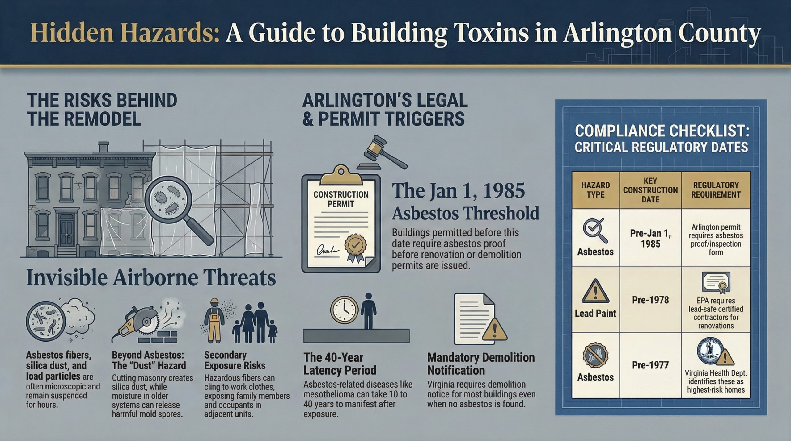 In Arlington County, the danger is often not the building itself. It is what happens when someone cuts into it, drills through it, tears it open, or rushes to modernize it without treating old materials like a live hazard. Arlington’s own permit process flags buildings originally permitted before January 1, 1985, for asbestos proof before renovation or demolition permits are issued, and every demolition permit application requires an asbestos awareness form. At the same time, Virginia says demolition notification is required for most buildings even when no asbestos is found, because the law is built around inspection, not assumptions. In a county with dense redevelopment corridors, a large multifamily housing stock, and 44.4 million square feet of rentable building area, renovation, demolition, and major maintenance can expose workers, tenants, students, patients, and nearby occupants to asbestos fibers, silica dust, lead dust, mold-related airborne contaminants, and other irritants if the job is handled carelessly.