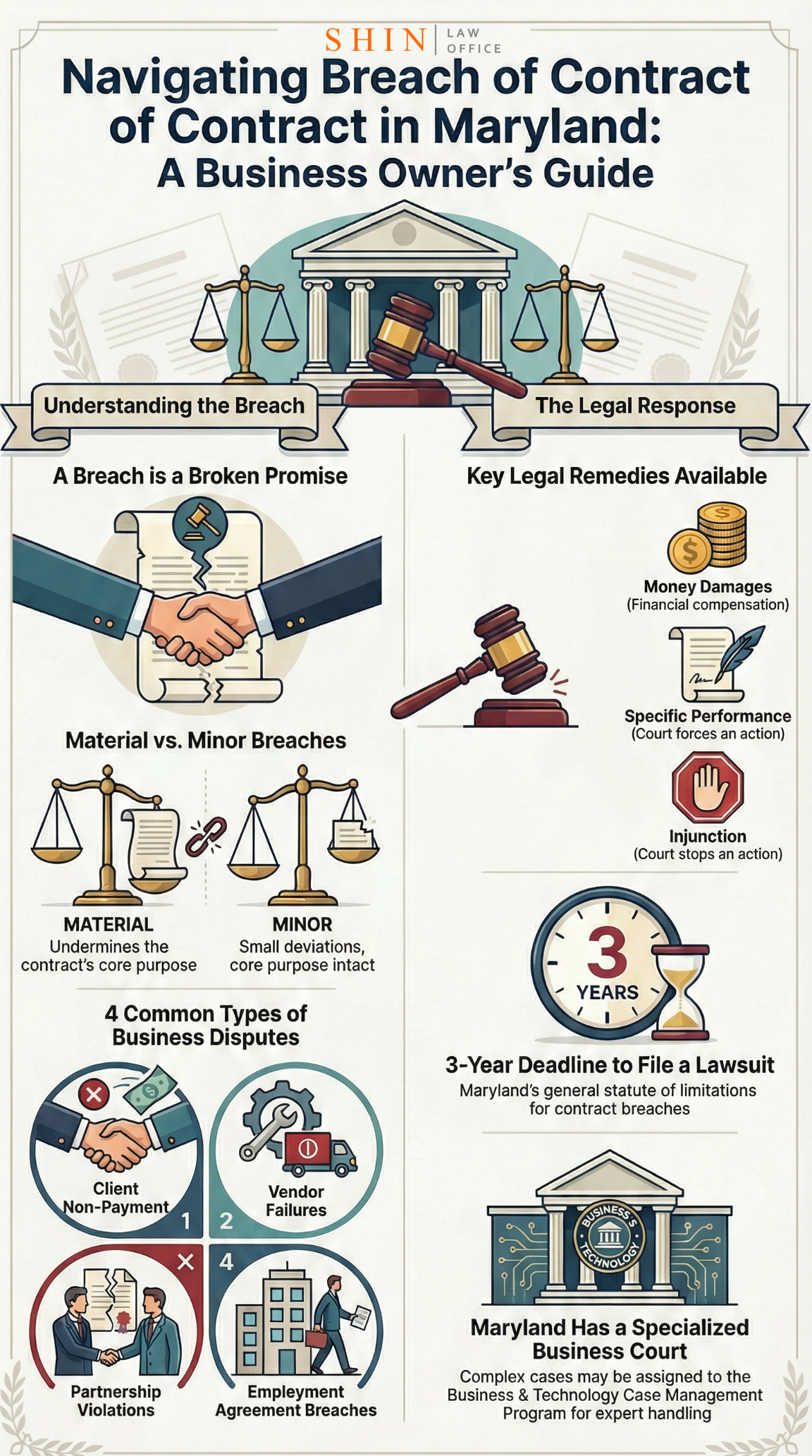 Conclusion: Facing a breach of contract dispute can be daunting for any business, but you don’t have to navigate it alone. As an attorney who regularly handles these cases in Montgomery County, I always emphasize two things to my clients: prevention and preparation. Preventive measures – like clearly written contracts, careful review of terms (especially notice requirements, cure periods, and dispute resolution clauses), and timely communication when problems arise – can avert many breaches or at least strengthen your position if litigation ensues. But when a breach is unavoidable, being prepared to enforce your rights is key. Maryland law provides robust remedies to the wronged party, and our local court system is well-equipped to handle business litigation efficiently and fairly. By understanding how breaches are proven and resolved, you put your business in the best position to either avoid the courtroom or, if needed, to prevail in it. If you find yourself in a contract crisis, consulting an experienced business litigation attorney early can make all the difference – whether it’s negotiating a fix or fighting it out under the courthouse’s fluorescent lights. My role is to shoulder that burden so you can get back to what you do best: running your business, hopefully with lessons learned and contracts intact for the future.