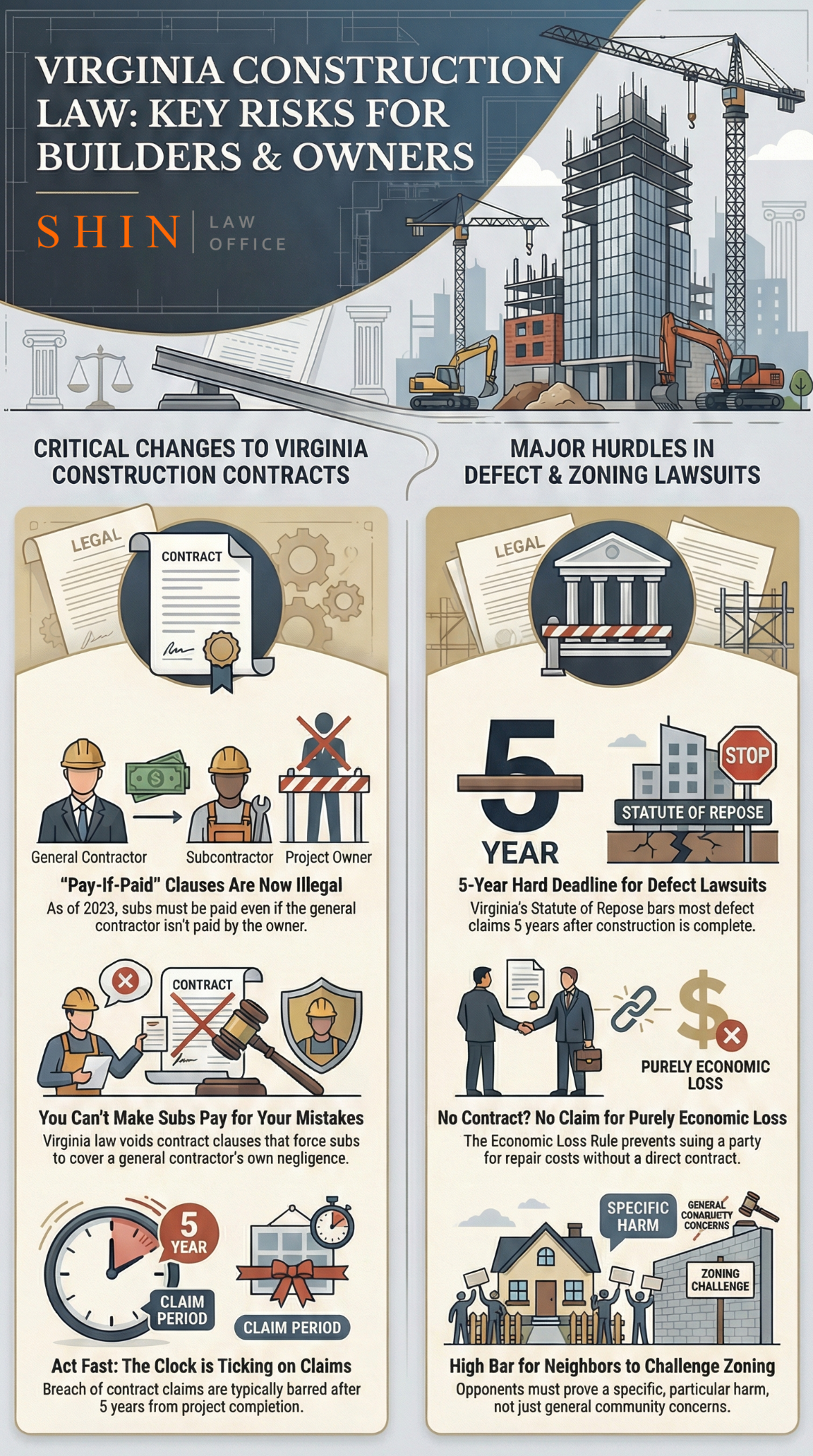 4. Know the Law or Find a Lawyer Who Does: Virginia construction law is a mix of statutes and court-made doctrines that isn’t always intuitive. For instance, the economic loss rule will bar certain claims even if they feel “fair”. Sovereign immunity and standing can torpedo a lawsuit before it starts. And new laws (like the ban on pay-if-paid) can dramatically change rights and obligations mid-project. Whether you’re a developer, contractor, or property owner, having legal guidance from someone who knows this landscape is invaluable. I often function as both a sword and a shield – helping clients assert their rights forcefully when needed, while also navigating pitfalls and expensive dead ends in litigation.