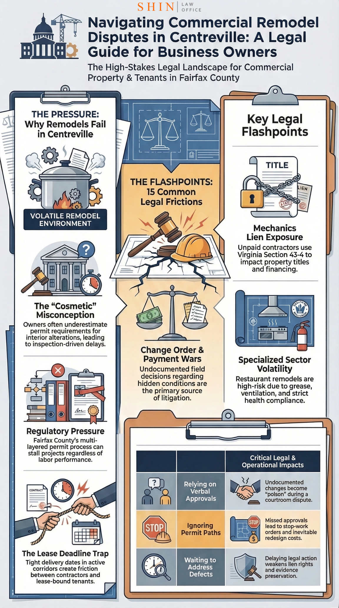Commercial remodel disputes in Centreville are usually not random. They follow patterns. Tenant buildout fights. Payment disputes. Change order problems. Delay claims. Defective workmanship. Incomplete buildouts. Lease improvement conflicts. Lien pressure. Permit and inspection issues. Cost overruns. HVAC and electrical failures. Structural surprises. Restaurant remodel breakdowns. Punch list battles. Warranty claims.