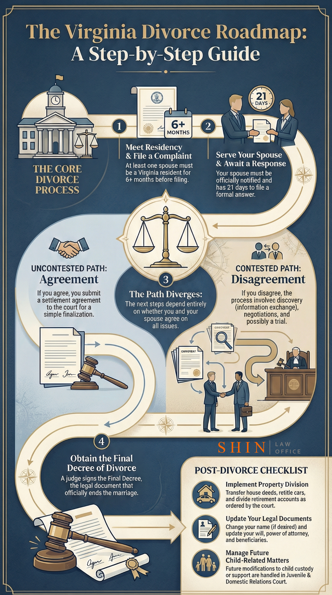 No matter what type of divorce path you choose (uncontested, mediated, contested, etc.), every divorce in Virginia follows the same general legal roadmap. Think of this as the Divorce Journey – the specific scenery might differ (collaborative conference room vs. courthouse, amicable chats vs. heated debates), but the checkpoints along the way are consistent. In this chapter, I’ll outline the step-by-step process for a Virginia divorce from start to finish, with practical insights for residents of Northern Virginia counties.