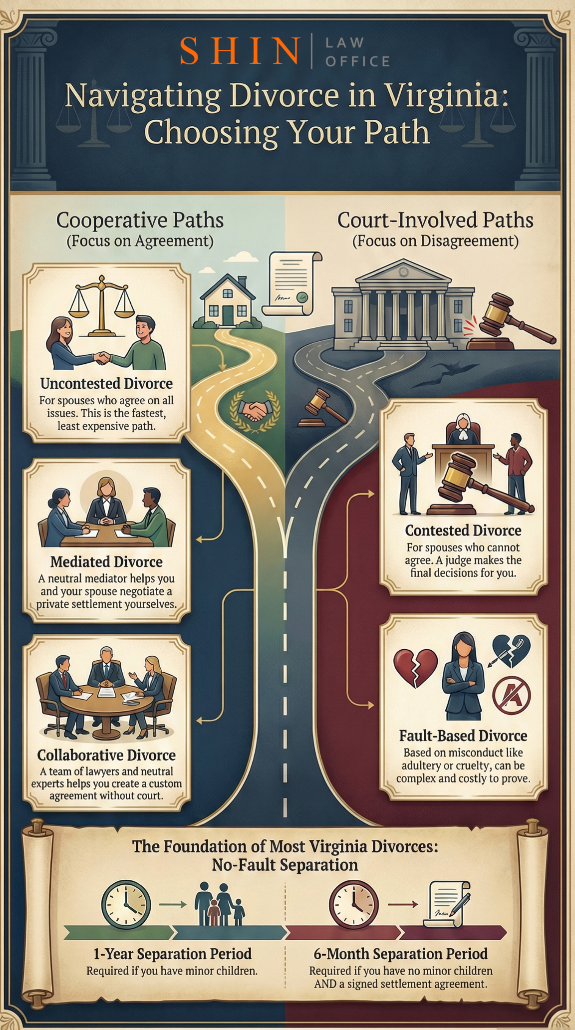 “How do I even start?” As a divorce attorney, I hear this question often. Divorce can feel overwhelming, but the first big decision is choosing how you’ll divorce. In Virginia, there are multiple divorce paths, and picking the right one can save you time, stress, and money. Let me share how I help clients in Northern Virginia, from Loudoun to Arlington, choose the approach that best fits their circumstances.