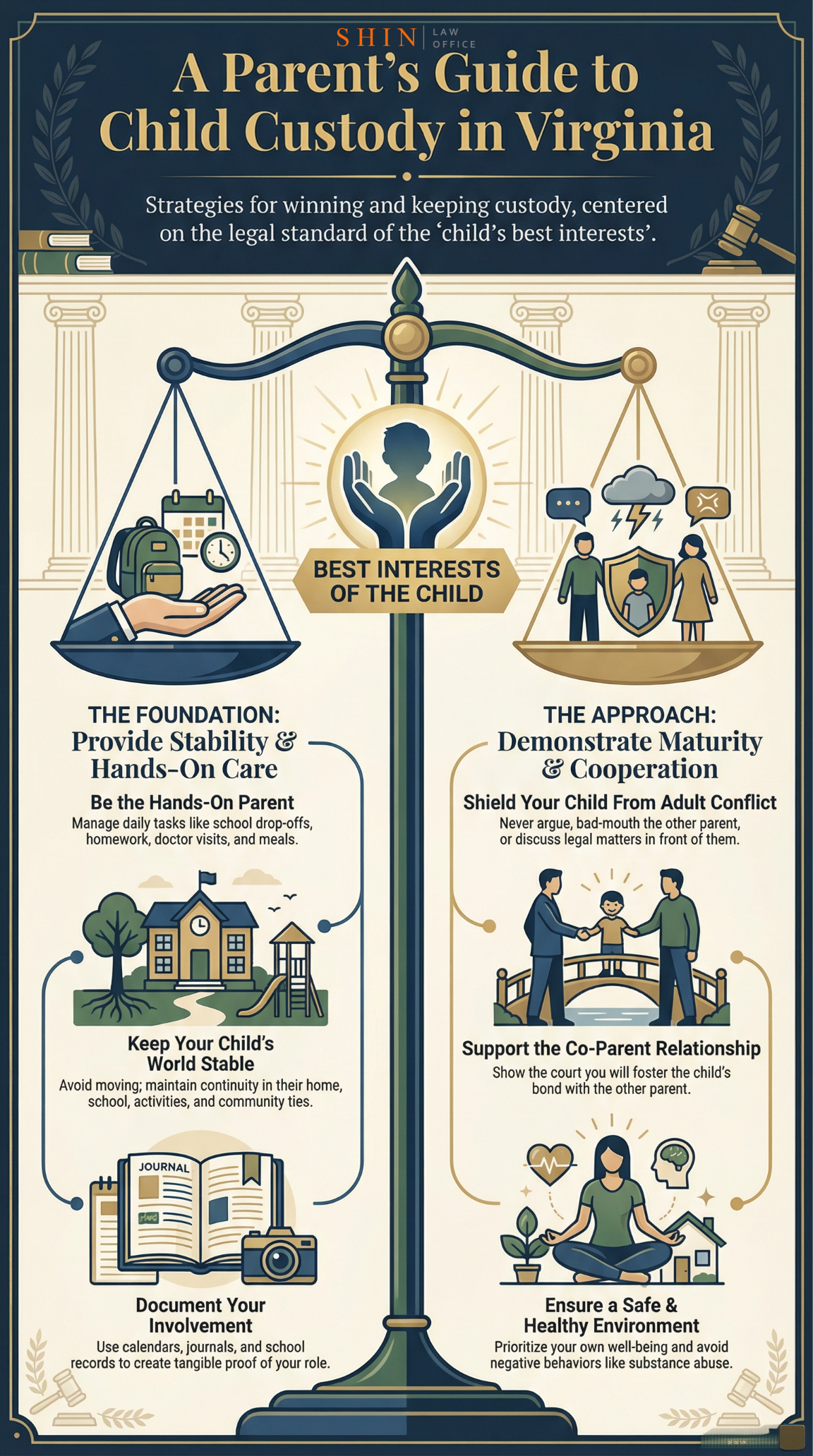 The key takeaways from this comprehensive journey can be distilled into one principle: always act in your child’s best interests. As I’ve shared from my Northern Virginia practice, when a parent consistently prioritizes the child’s well-being – by providing stability, love, safety, and cooperation – it not only benefits the child but naturally aligns with what courts and Virginia law are looking for. Custody cases are challenging, emotionally and legally. But if you approach each step thoughtfully – from managing your daily interactions, to documenting your efforts, to presenting your case through the lens of Virginia’s best interest factors – you greatly increase your chances of achieving a favorable outcome.