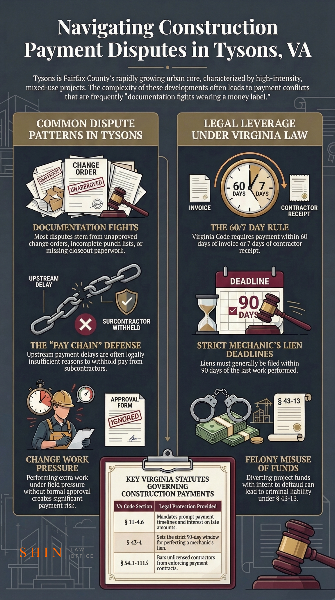 If your company is dealing with withheld payment, disputed change work, retainage issues, lien exposure, or a breakdown between contractor and subcontractor on a Tysons project, the smart move is to evaluate the claim before the deadlines and leverage disappear. Shin Law Office represents businesses in high stakes Virginia commercial disputes, including construction payment litigation in Fairfax County. Call 571 445 6565 or contact the firm through the online form to discuss the dispute.