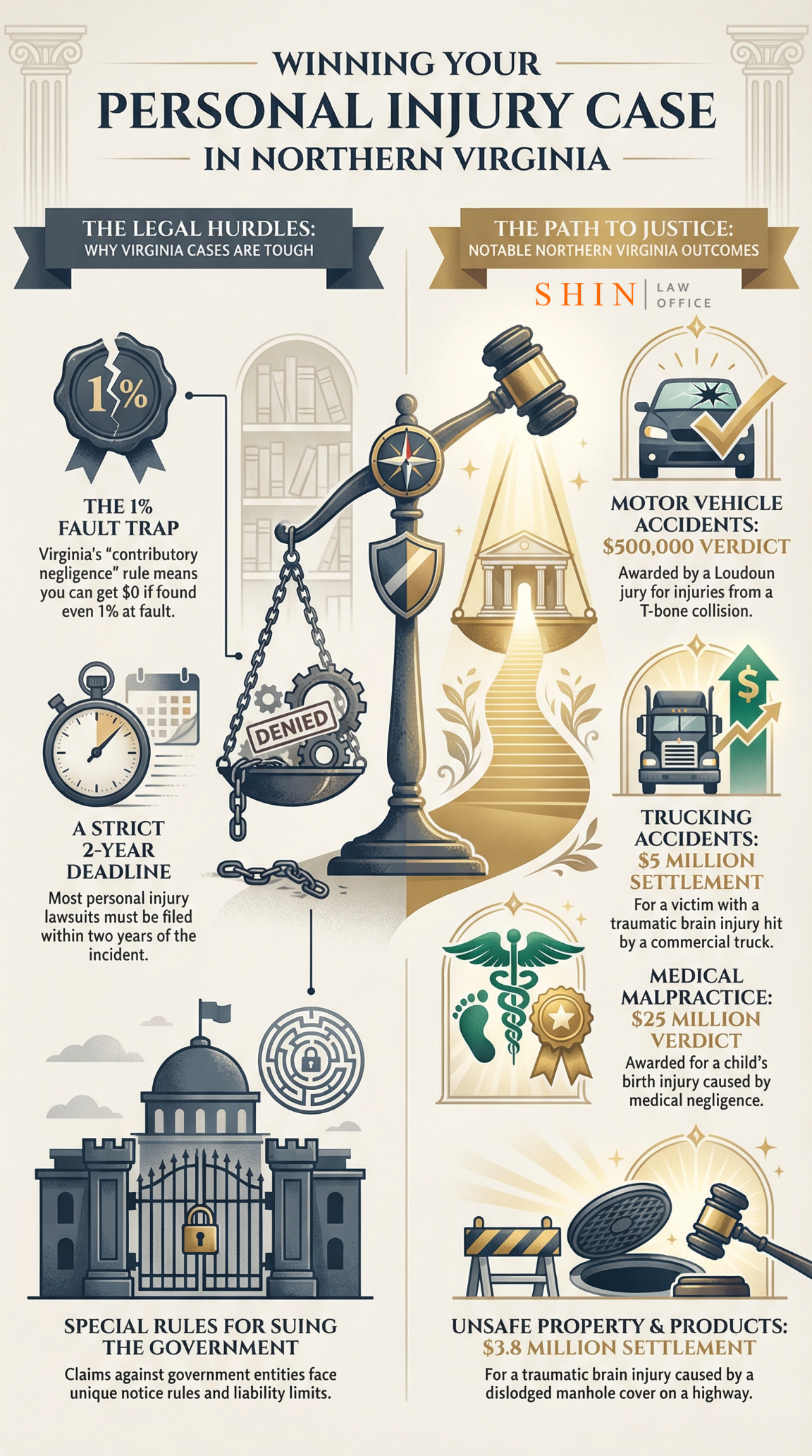 Residents of Northern Virginia, including Fairfax, Loudoun, Arlington, Prince William, Clarke, and Frederick counties, face a wide range of personal injury risks, from car crashes on dangerous highways to medical malpractice in local hospitals. Virginia’s tough contributory negligence laws (even 1% fault by an injured person can bar recovery) and a strict two-year filing deadline make pursuing compensation challenging. Notable verdicts in the region show that with skilled legal advocacy, victims can still obtain justice – for example, a Fairfax jury awarded $311,000 to a rear-end crash victim and a Loudoun jury returned $500,000 for a T-bone collision injury. Shin Law Office, based in Leesburg, leverages local knowledge and sharp litigation strategies to help Northern Virginia clients navigate these cases. This comprehensive guide outlines key personal injury case types, highlights significant local verdicts/settlements, and explains how Shin Law Office works to secure results for injured residents.