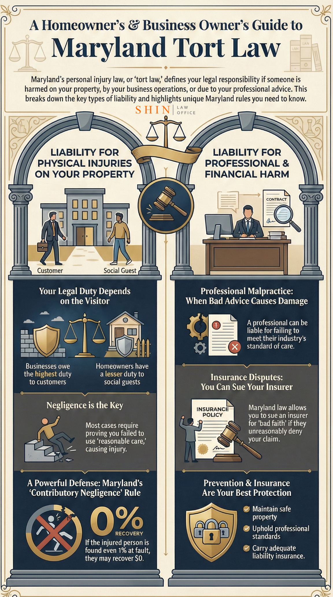 Lawsuits over accidents and injuries can happen to anyone – even homeowners and business owners here in Montgomery County. Everyday scenarios like a slip-and-fall at your home or a client suing for negligent professional advice are common examples of tort cases. As an attorney practicing in this community, I want to demystify how Maryland’s personal injury law works in these situations. In this blog, I’ll explain in plain English the key concepts – from a property owner’s duty to keep visitors safe, to a professional’s liability for bad advice, to insurance disputes when claims are denied – all with a local Montgomery County perspective. The goal is to give homeowners and business owners a clear understanding of their rights and risks under Maryland law, including unique rules like our “contributory negligence” doctrine (where if you are even 1% at fault, you might recover nothing). Let’s dive in, chapter by chapter, so you know what to expect and how to protect yourself.