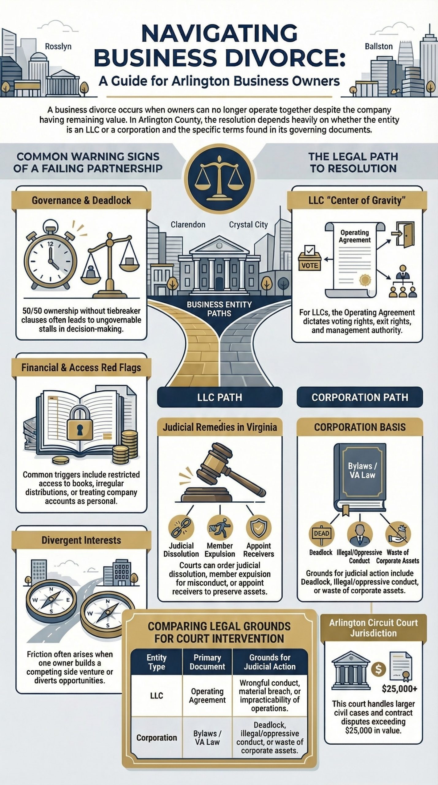 Virginia LLC law allows members to regulate company affairs by operating agreement and permits judicial dissolution when it is not reasonably practicable to continue in conformity with the articles and operating agreement. Virginia corporate law separately allows judicial dissolution in certain deadlock, oppressive conduct, fraudulent conduct, or asset misuse scenarios. Arlington Circuit Court handles civil claims above $25,000, and Arlington’s official planning areas include Rosslyn, Courthouse, Clarendon, Virginia Square, Ballston, Pentagon City, Crystal City, Columbia Pike, Cherrydale, East Falls Church, Nauck, and Shirlington.