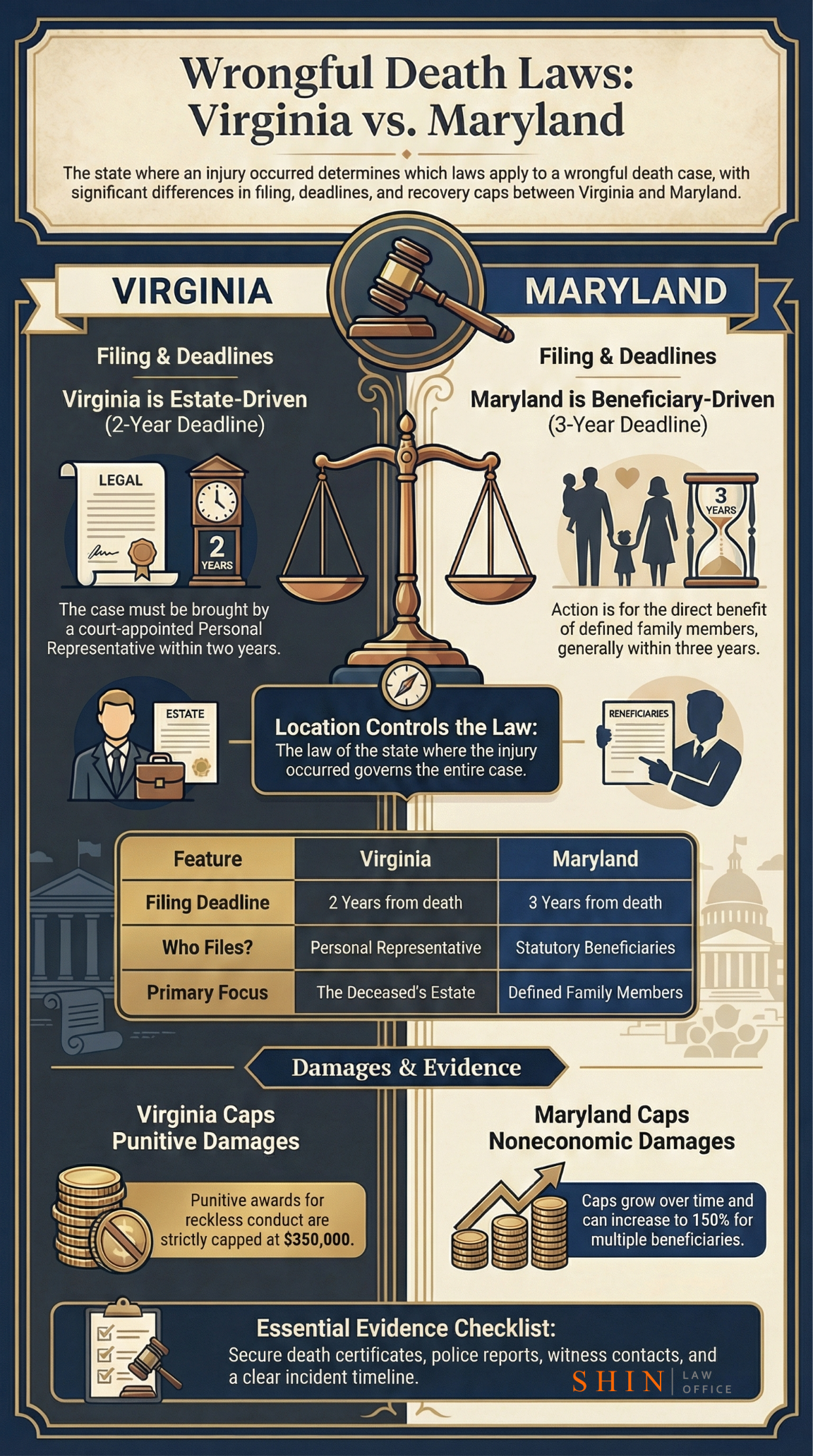 Here is the big practical difference: Maryland limits noneconomic damages in many wrongful death cases, and that cap grows over time.